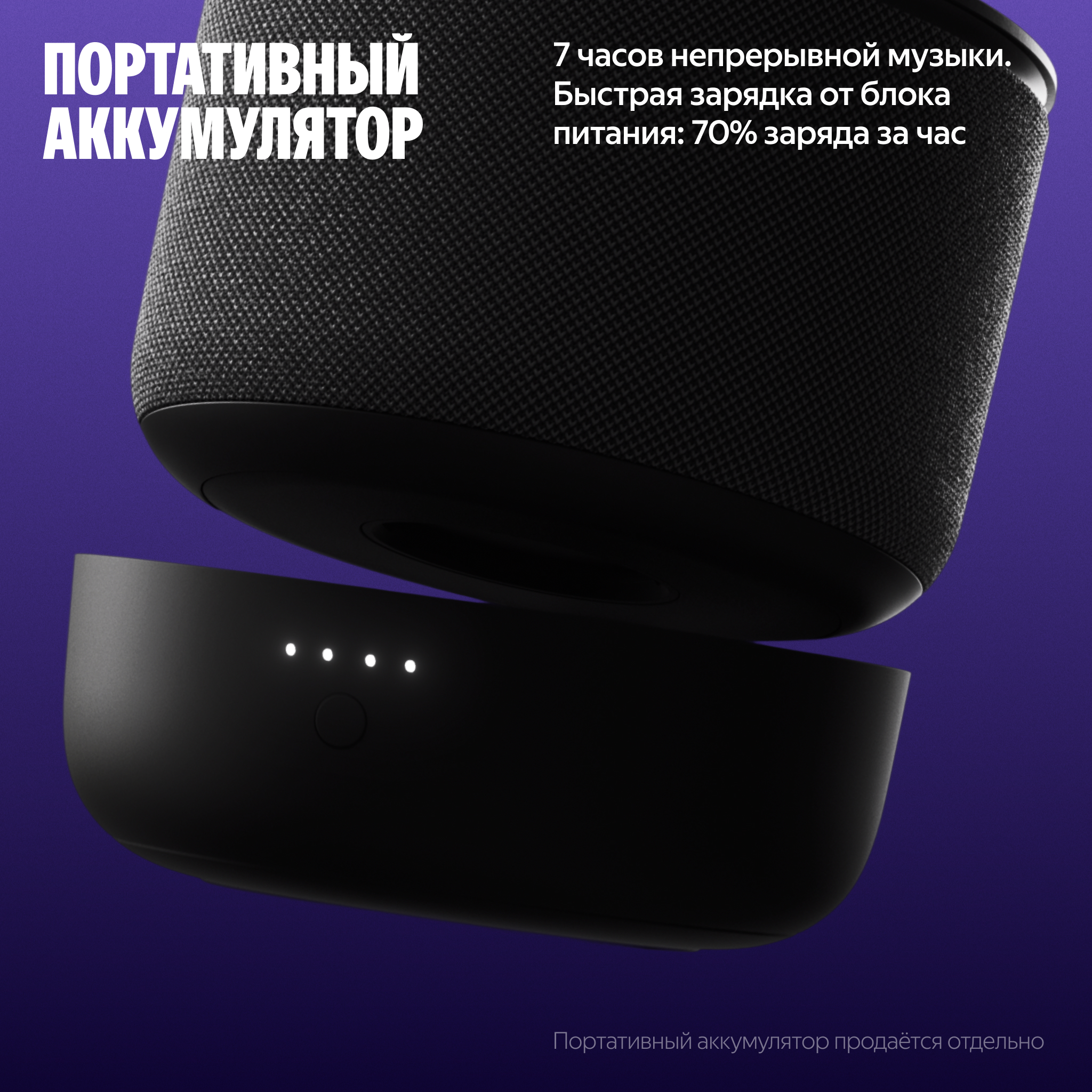 Дополните Станцию Мини 3 Про портативным аккумулятором — и носите её с собой из комнаты в комнату⁶. Заряда хватит на 7 часов непрерывного прослушивания музыки⁷. Аккумулятор приобретается отдельно.
