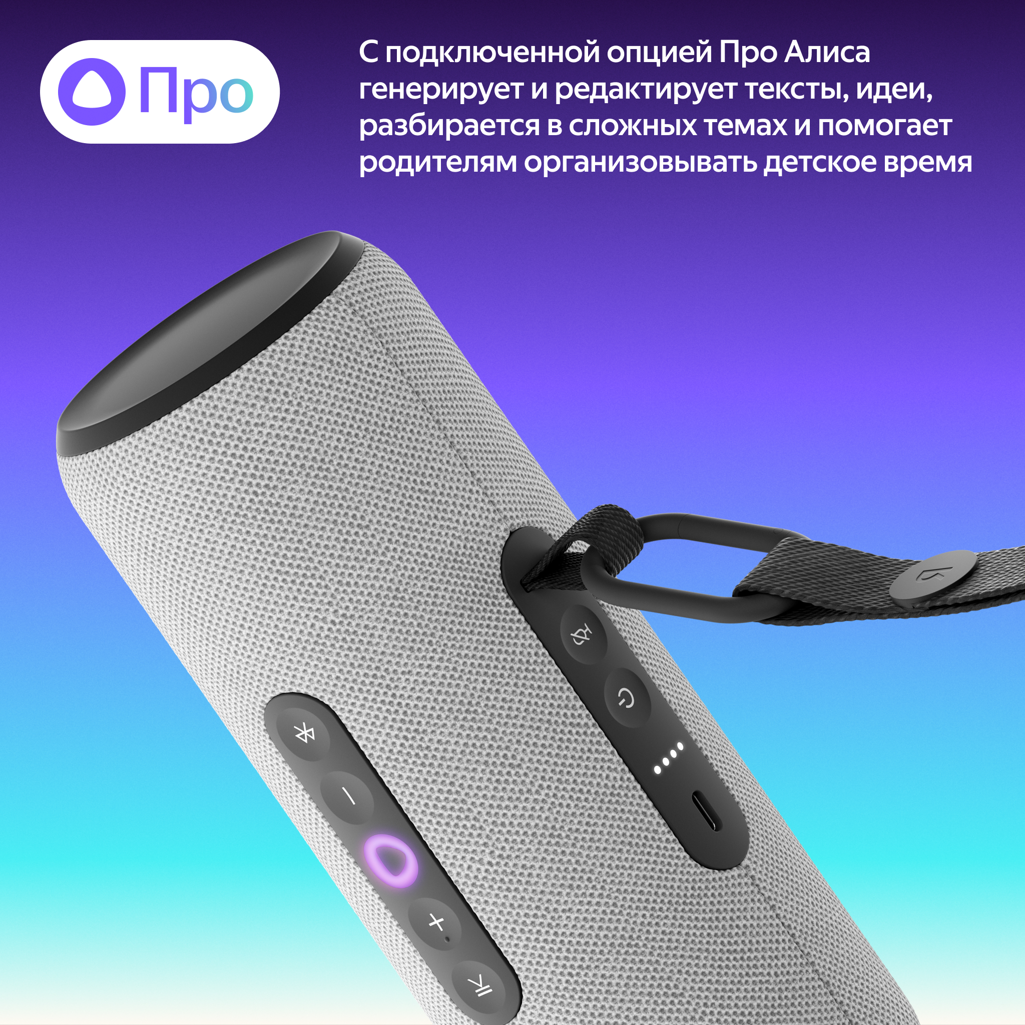 Яндекс Станцию Стрит удобно держать в руке, ставить вертикально или горизонтально, а с помощью съёмного ремешка с карабином её можно вешать, куда захотите — например, на рюкзак.