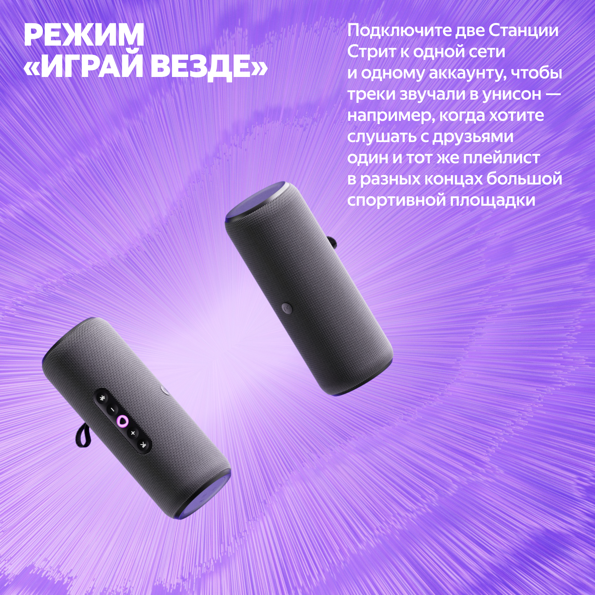 Яндекс Станция Стрит — первая портативная умная колонка Яндекса с мощным звучанием, AI-ассистентом Алисой и ёмким аккумулятором. Берите её с собой, куда бы вы ни отправились, и управляйте любимой музыкой голосом по Wi-Fi®︎ и Bluetooth®︎.