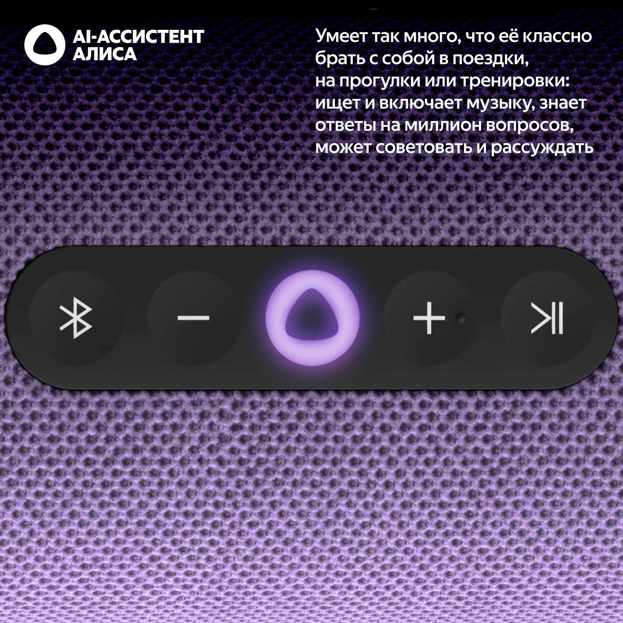 Алиса будет на связи с вами там, где есть мобильный интернет, — просто подключите умную колонку к Wi-Fi® точке доступа на смартфоне. А если такой возможности нет, можно связать Яндекс Станцию Стрит с телефоном по Bluetooth® и управлять музыкой с помощью быстрых команд, например: «Дальше», «Громче», «Стоп».